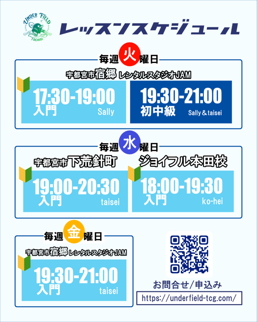 | 毎週水曜日 | 18:00-19:30 上三川ジョイフル本田校 | 入門クラス | ko-hei |
